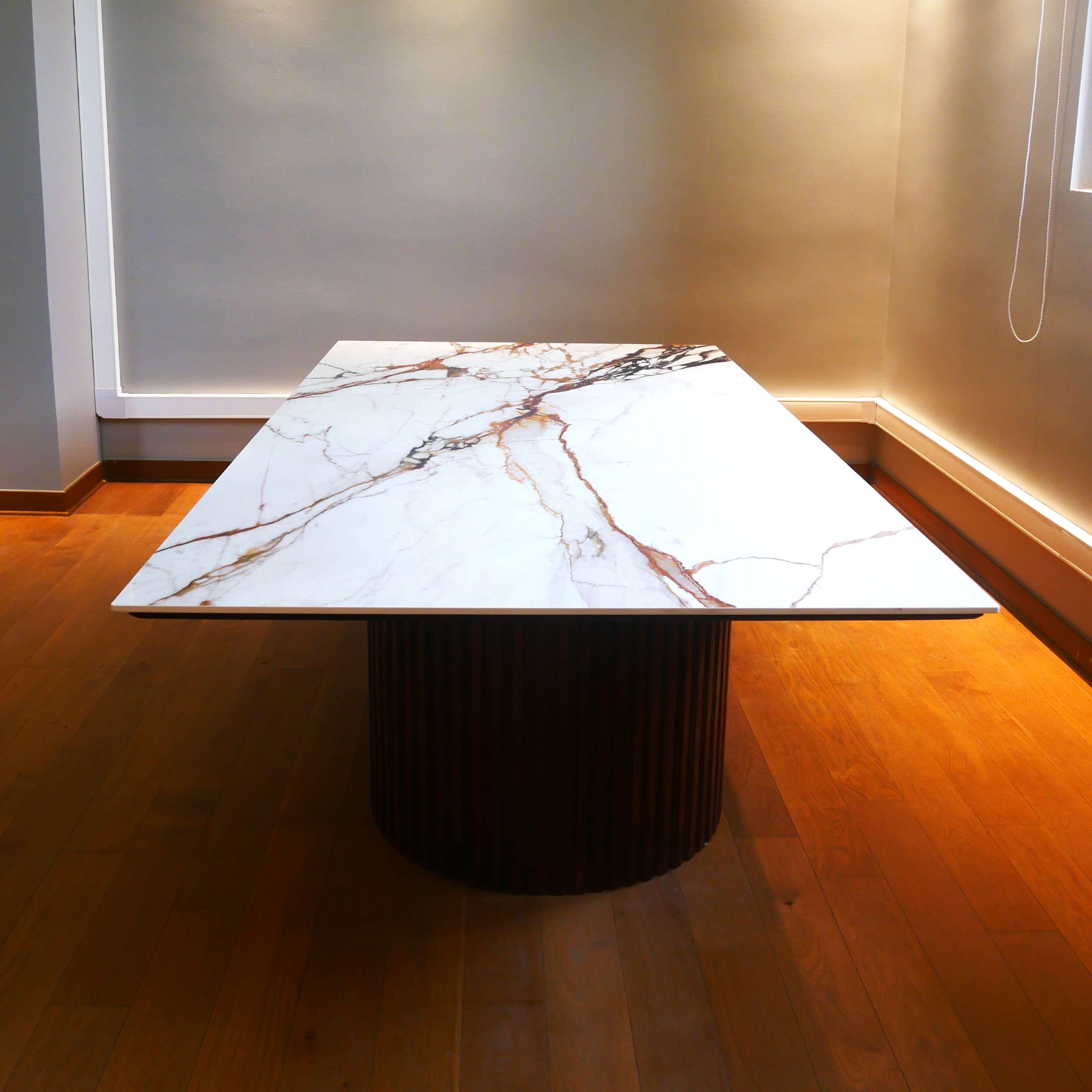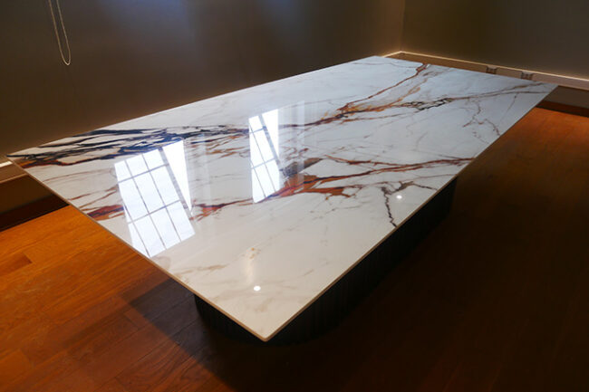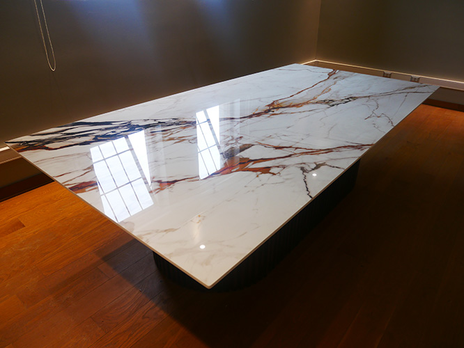 Materiales nobles como la madera roble americano y piedra sinterizada.