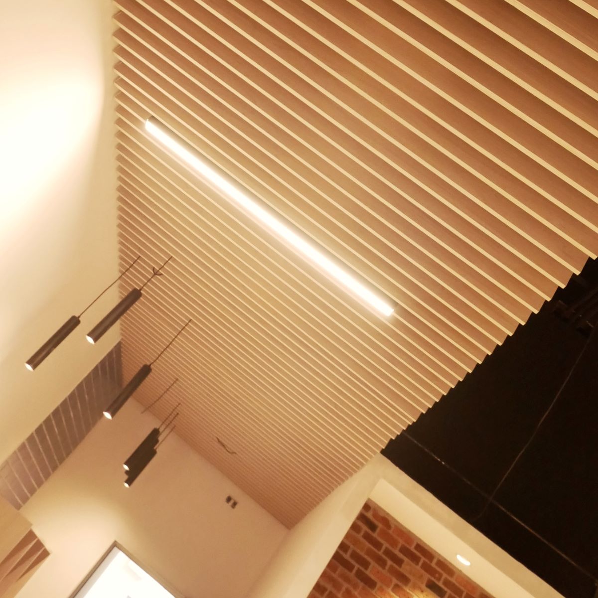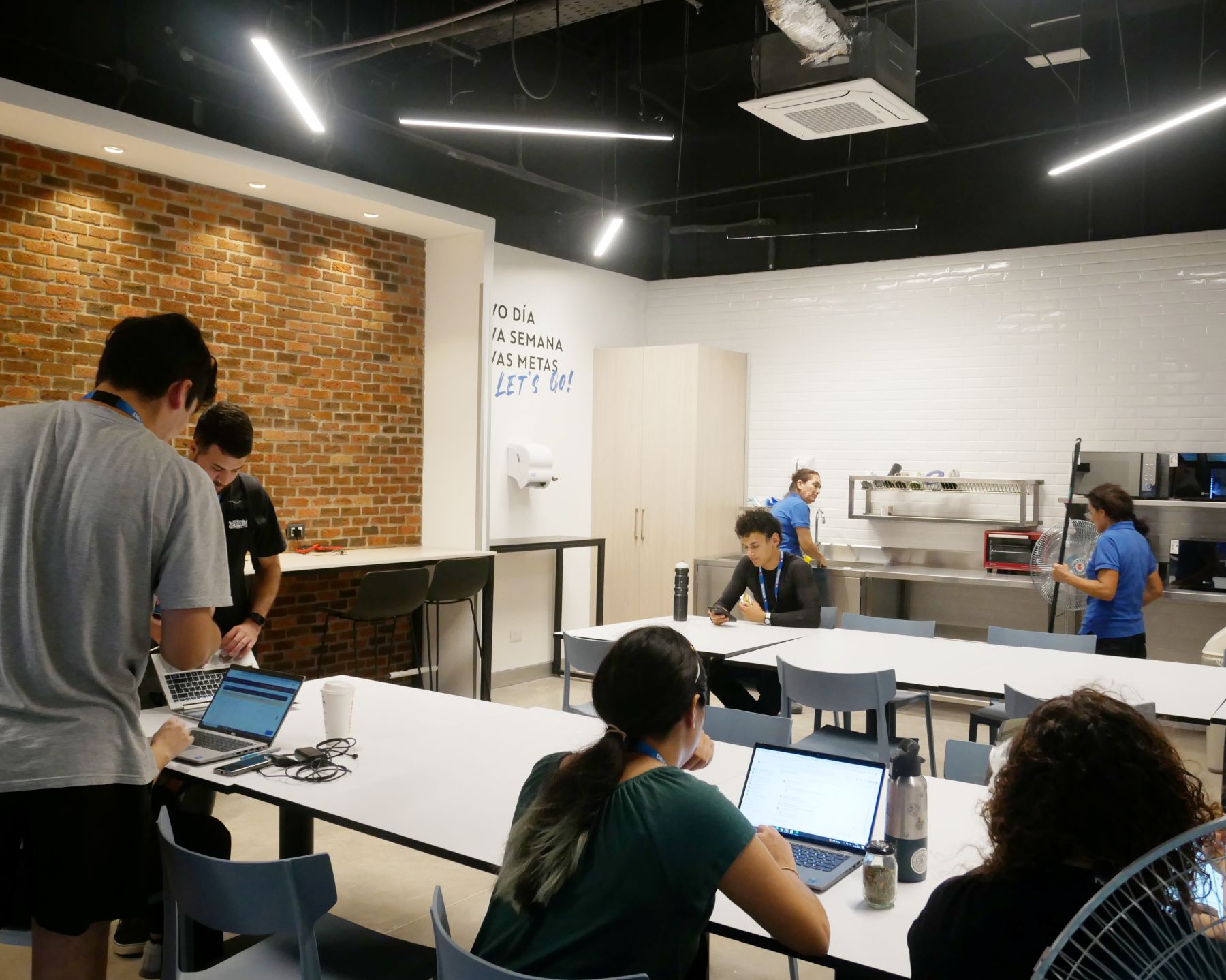 Sala de pausa. equipamiento del mobiliario para zona de alimentación y a la vez trabajo colaborativo. Se complementa con revestimiento de cielo tipo palillaje.