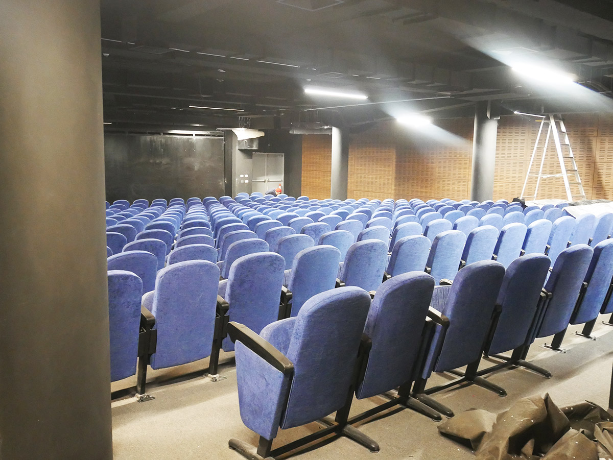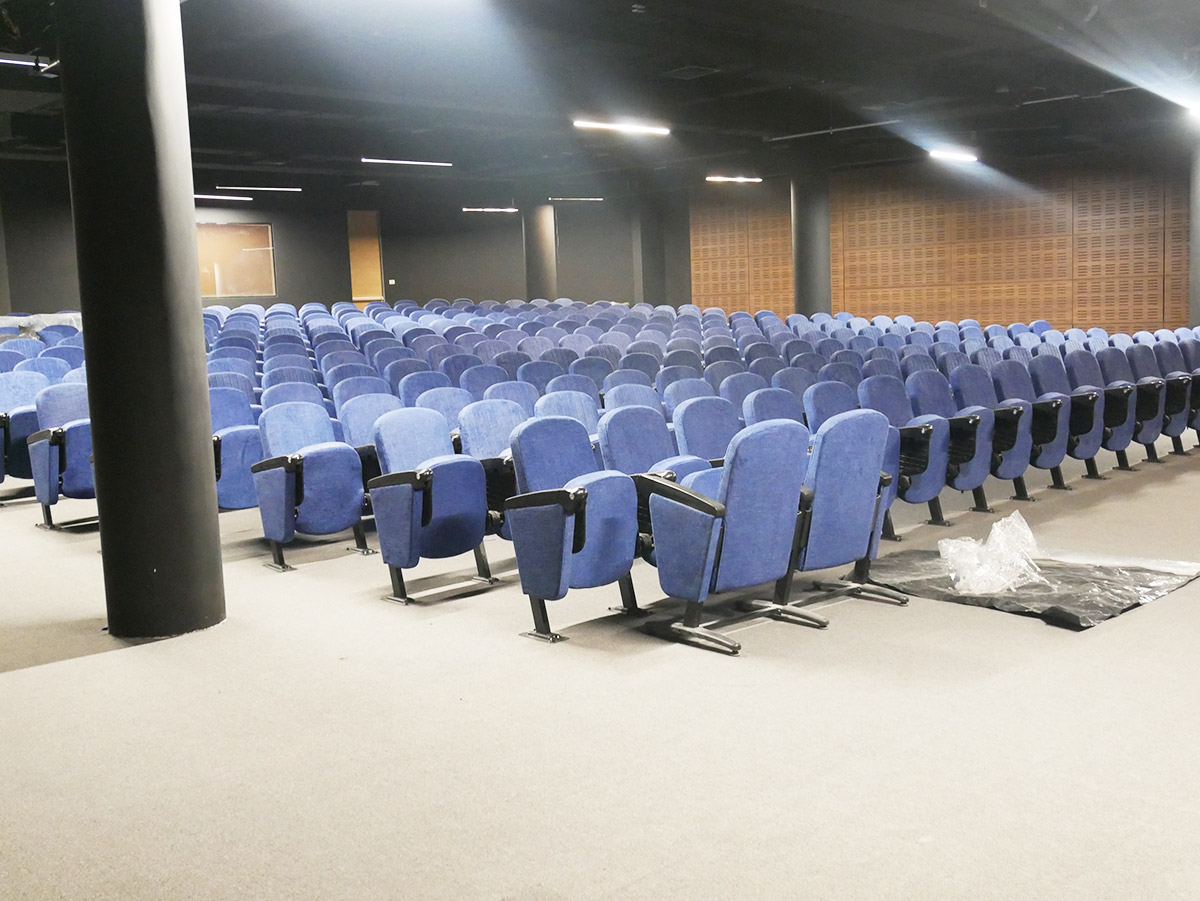 En cuanto al auditorio, el encargo fue orientar y gestionar la importación y la instalación de butacas, alfombra y escenario automatizado.